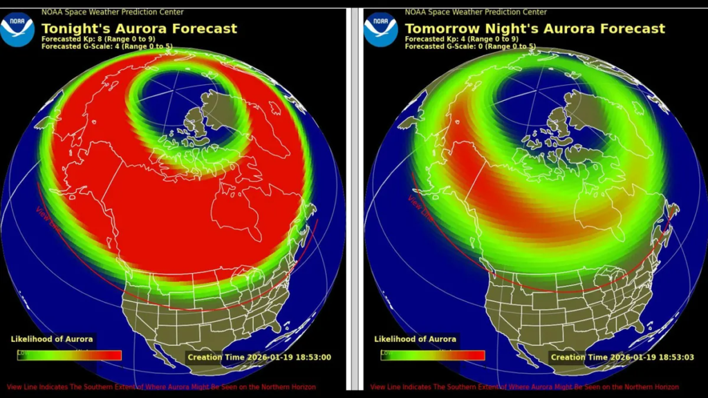 • Kp 5–6: Typical auroras visible in northern states